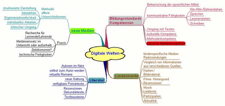 Die folgende MindMap führt nur einige wichtige Punkte auf, die für den Spanischunterricht besonders wichtig beim Lernen mit neuen Medien sind.