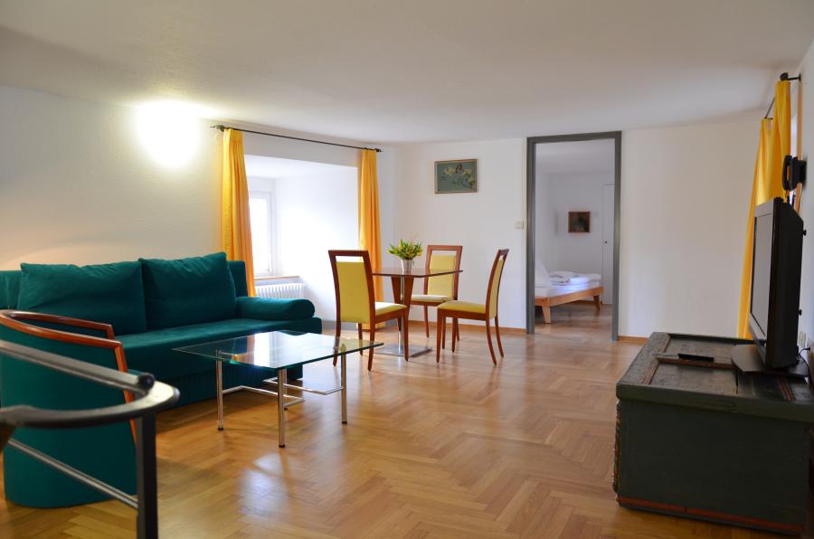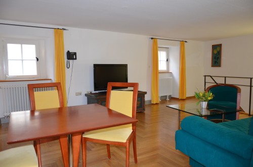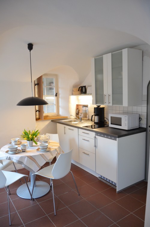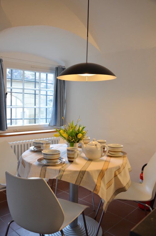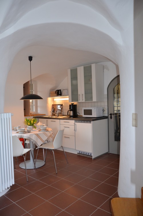 Die Ferienwohnung (70qm) befindet sich im 1562-1575 erbauten Torbau der ehemaligen Klosteranlage in ruhiger Lage mit herrlichem Ausblick auf die Allee und ins Tal. Sie eignet sich für 2-4 Personen. Ein Schlafzimmer mit zwei Einzelbetten, ein Wohnraum mit Ausziehcouch im 1. OG, eine neue Küchenzeile mit Essecke, Dusche, WC im EG, Kabel-TV sind vorhanden. Die Küche verfügt über ein Ceran-Kochfeld mit zwei Kochstellen, Mikrowelle, Kaffeemaschine, Wasserkocher, Toaster, Spülmaschine, Kühlschrank mit Gefrierfach. Von ihr aus ist ein sichtgeschützter Gartenraum mit ca. 20qm mit einer Sitzgruppe zugänglich. Die Ferienwohnung wurde Ende 2013 renoviert und mit einer neuen Zentralheizung ausgestattet.